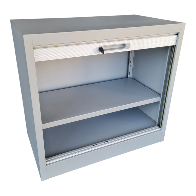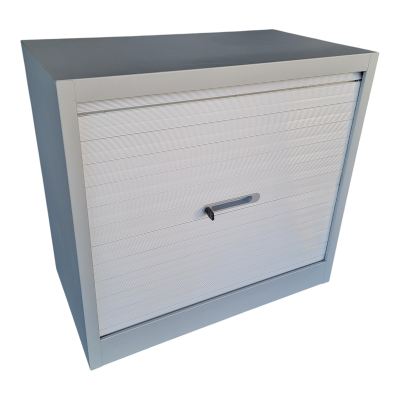 Armoire basse à rideaux, avec ouverture vers le haut pour un gain de place lors de l'aménagement de votre espace d'entreprise.