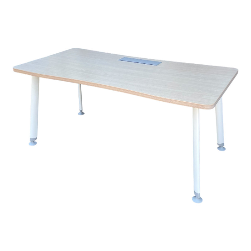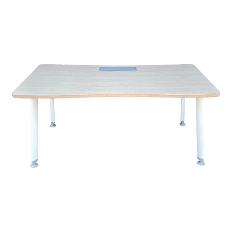 Bureau rectangulaire avec plateau en bois clair et coins arrondis pour disposer d'un bel espace de travail.