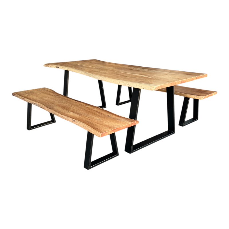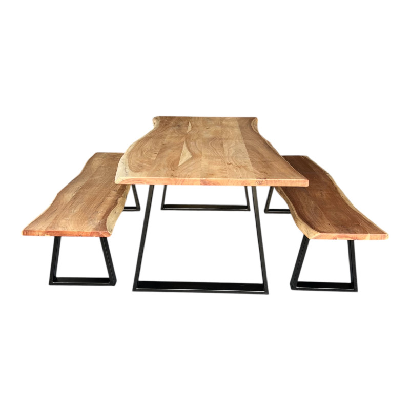 Matières de la table et des bancs : bois massif (acacia) et métal noir